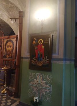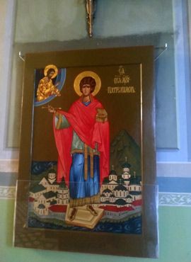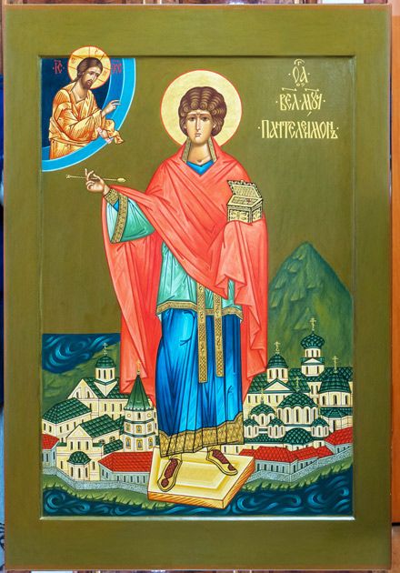 По благословению настоятеля храмов Благовещения ПрСвт Богородицы и свт. Митрофана Воронежского иерея о. Феодора Лукьянова, и по заказу прихожанки храма Ольги Алексеевны Виноградовой, приходским иконописцем и руководителем приходской шконописной школы Митрофаньевского храма Наталией Петровной Масловой написана ростовая икона св. вел.муч. Пантелеимона в композиции с Пантелеимовским монастырём на Святой горе Афон.